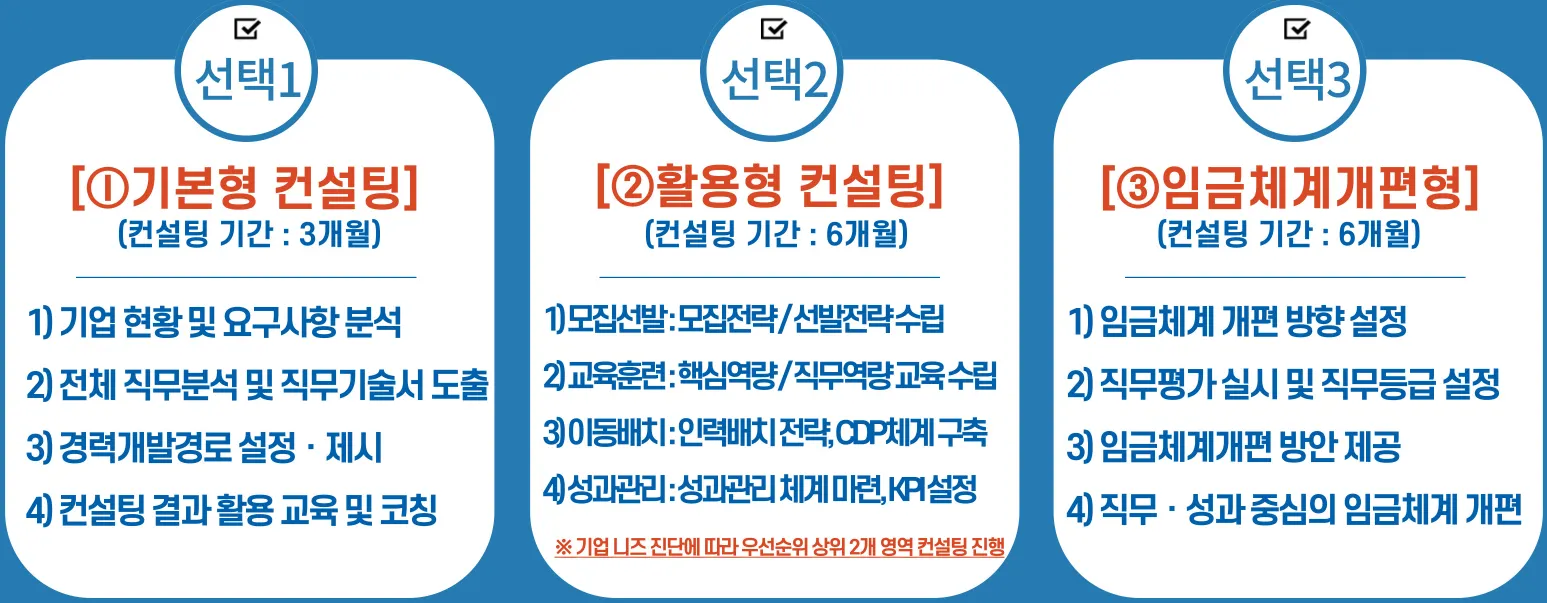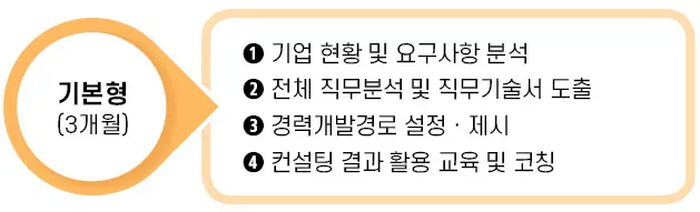상시 근로자수 30인 이상의 중소·중견기업에 NCS기반의 직무분석 및 경력개발 경로 설정, 역량모델링, 컨설팅 결과 활용교육, 체계적인 직무·성과 중심의 인사관리 방법론 (모집선발, 교육훈련, 성과관리체계, 이동배치, 임금체계 개편 등)을 제시·적용하는 컨설팅입니다.